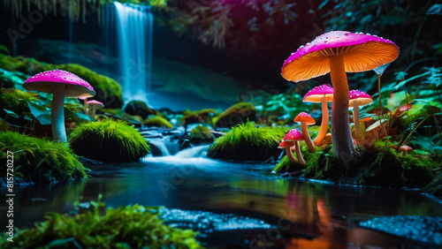 Fantasy magical Mushrooms glade in enchanted fairy tale dreamy elf Forest, fairytale rose flower garden and butterflies on mysterious background,