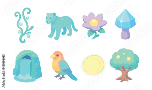 fantasy, nature, icon, vine, panther, flower, crystal, waterfall, bird, sun, tree, mystical, magic, whimsical, pastel, fauna, flora, environment, symbol, artistic, decorative, elegant, mythical, serene, bright, illustration, design, visual, creative, colourful, enchanting, scenic, peaceful, land, sky, animal, plant, natural, art, element, concept, image