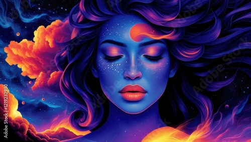 Fantasy portrait, ethereal blue-skinned woman, closed eyes, flowing dark hair, cosmic background, vibrant orange and purple clouds, starry night sky, dreamy atmosphere, digital painting, surreal art,