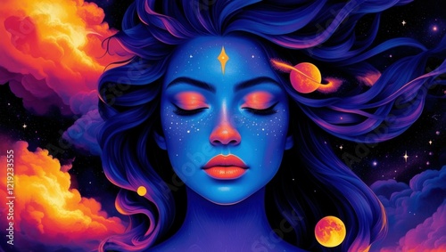 Fantasy portrait, ethereal blue-skinned woman, closed eyes, flowing dark hair, cosmic background, vibrant orange and purple clouds, starry night sky, dreamy atmosphere, digital painting, surreal art,