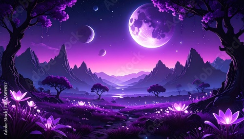 fantasy, landscape, purple, moon, surreal, art, digital artwork, illustration, nature, sky, tree, mountain, scenic, alien, galaxy, glowing, mystical, dream, whimsical, wallpaper, background, night, space, cosmos, star, vibrant, beautiful, peaceful, serene, magic, wonderland, design, artistic, creative, scenery, celestial, bright, aethereal, violet, flower, path, trail