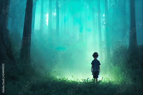 fantasy scenery showing the boy standing in front of the magic gate with glowing blue light in beautiful forest, digital art style, illustration painting