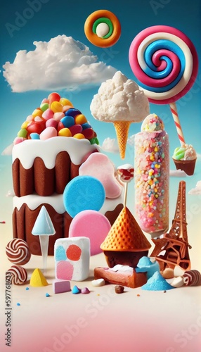 Fantasy village, kingdom or town made of sweets, ice-cream, marshmallow, cookies, candies, lollypops, cakes, cupcakes, street view. Colorful sweet world with houses and buildings.