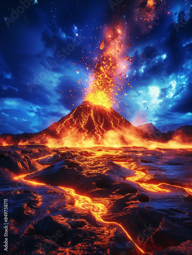 Fantasy volcano eruption, lava and smoke, blue sky. Wall Art Poster Print Design for Home Decor, Decoration Artwork, High Resolution Wallpaper & Background for Computer, Smartphone, Cellphone, Mobile