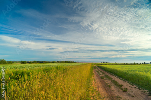 Farm fields with potatoes in rural Prince Edward Island, Canada. The Confederation Bridge can be seen at the horizon.