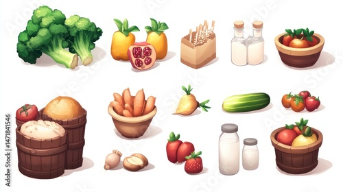 broccoli, orange, pomegranate, pineapple, straw, paper, milk, tomatoes, carrot, beet, cucumber, strawberry, bread, flour, ginger, spice, container, basket, healthy, organic, food, harvest, farm, vegetable, fruit, agriculture, grocery, produce, market, ingredient, kitchen, cooking, natural, fresh, vitamin, nourishment, diet, vegan, vegetarian, wholesome, colourful, delicious, vibrant, tasty, rural