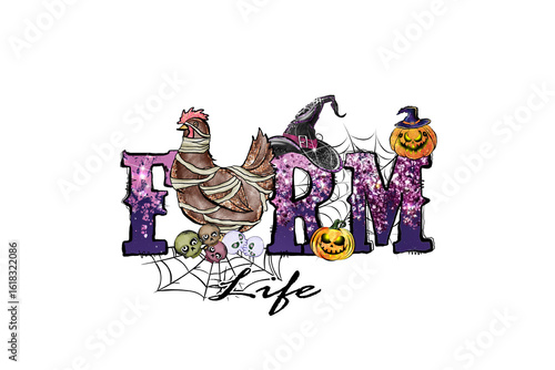 Farm Life Halloween Theme with Chicken, Spider Web, and Pumpkins Sublimation design isolated on transparent background