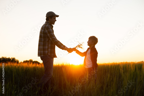 Farmer and his son in front of a sunset agricultural landscape. Man and a boy in a countryside field. Fatherhood, country life, farming and country lifestyle concept.