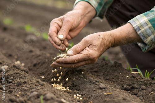 farmer hands gently planting seeds into soft, rich soil, showcasing care and dedication involved in nurturing crops