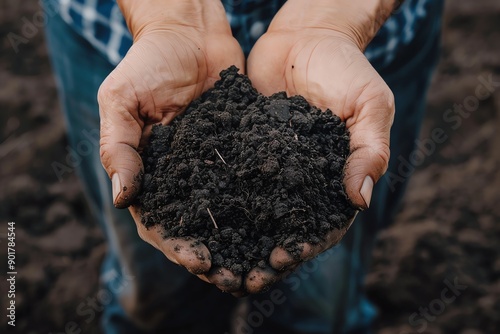Farmer holding handful of dark, fertile soil, organic cultivation, earths resources