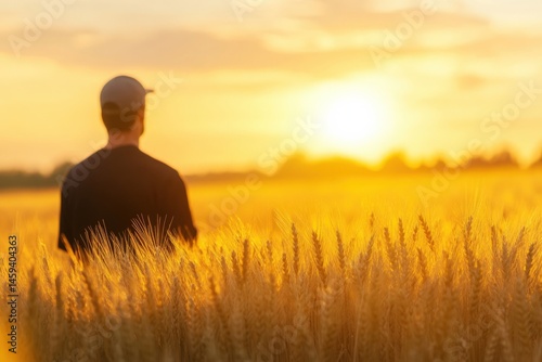 farmer, field, sunset, agriculture, wheat, crop, man, sky, gold, harvest, rural, countryside, nature, landscape, farm, outdoors, back, person, cap, growth, horizon, sun, light, summer, day, scenic, view, country, peaceful, serene, calm