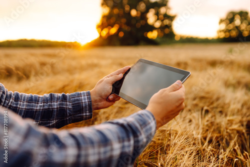 Farmer working with Tablet on wheat field. Modern technology application in agricultural growing activity. Growth dynamics.