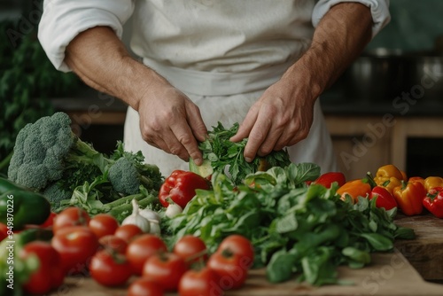 Farm-to-Table Concept: A rustic kitchen scene where a chef is preparing a meal with freshly harvested vegetables. The focus should be on the vibrant colors of the vegetables and the hands of the chef