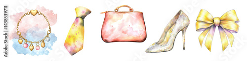 Fashion Accessories Collection: Bracelet, Tie, Handbag, Shoe, And Bow. Elegant Style And Design Watercolor Set Illustration Isolated On Transparent Background