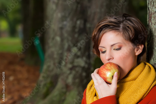 autumn, fall, woman, girl, lifestyle, leaf, people, beautiful, leaf, caucasian, park, portrait, young, holding, colourful, nature, orange, outside, beauty, joy, foliage, joyful, season, woman, cheerful, september, fashion, romantic, elegance, sexy, eating, apple, fruit, relaxing