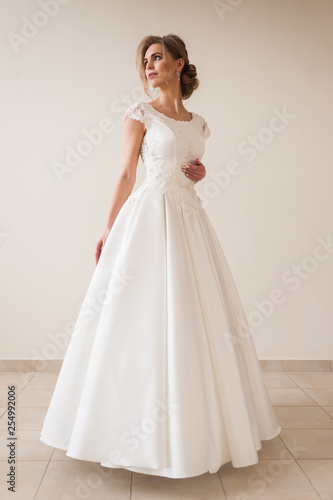 Fashion bride in gorgeous wedding dress studio portrait. Beautiful model with bridal makeup and hairstyle in marriage lace dress.