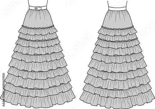 Fashion cad drawing of layered ruffle long skirt, technical flat sketch, tiered silhouette, waistband detail, vector illustration, garment template