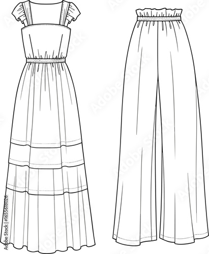 Fashion design, trendy summer dress, wide-leg pants, stylish clothing, wardrobe essential, sewing pattern, garment sketch, apparel vector, flat illustration, CAD drawing