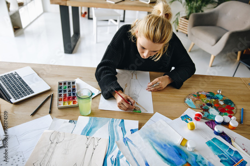 design, beautiful, business, person, girl, young, adult, people, beauty, european, creativity, style, fashion, watercolor, pretty, office, draw, stylish, work, drawing, indoor, blond, alone, attractive, workplace, paintbrush, paint, fashionable, sketching, sketch, professional occupation, fashion designer, caucasian woman