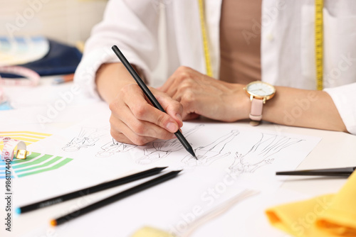 Fashion designer drawing sketch of beautiful outfit at table in workshop, closeup