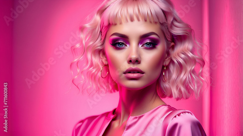 Fashion editorial Concept. Closeup portrait of stunning pretty woman with chiseled features, pink makeup.