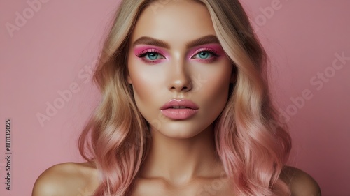 Fashion editorial Concept. Closeup portrait of stunning pretty woman with chiseled features, pink makeup