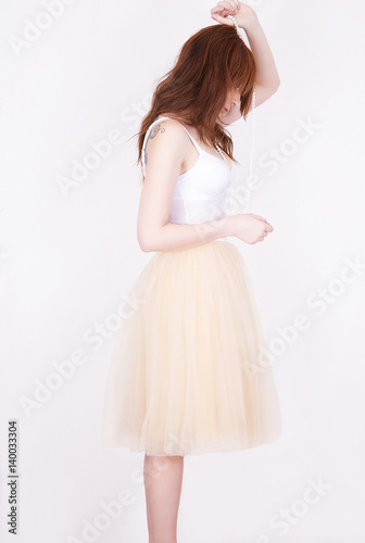 fashion girl in tulle skirt on white background