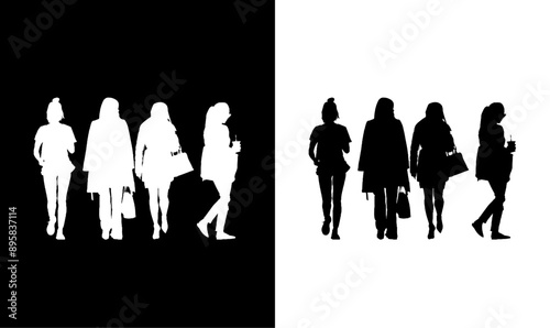 fashion girls' silhouette, illustration vector, art, design, group, fashionable, girl, bag, black, white, silhouette girl with bag,