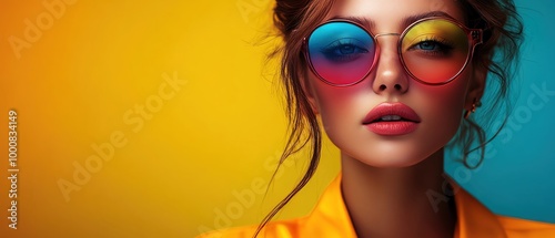 Fashion icon in bold rainbowcolored outfit, vibrant gradient background, pop art meets high fashion