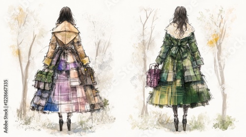 plaid, plaid, coat, fashion, patchwork, watercolor, clothing, winter, bag, drawing, autumn, seasonal, walking, style, fall, wood, vignetting, textile, chic, illustration, forest, accessory, imagery, stylish, woman, background, colours, visual, grace, tree, elegance, nature, painting, landscape, texture, backview, contemporary, sophisticated, modern, artistic, peaceful, misty, serene, calm, relaxed