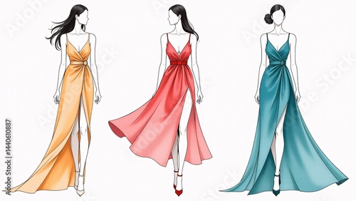 evening gown, dress, gown, fashion design, drawing, illustration, vignetting, clothing, apparel, style, elegance, chic, model, runway, collection, designer, artwork, fashionable, sewing, textile, garment, fabric, formal, event, party, celebration, art, creative, isolated, white background, cut-out, beauty, glamour, design, presentation, digital artwork, artistic, female, woman, figure, full-length