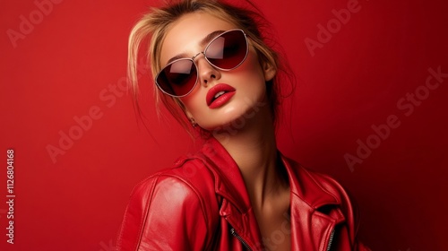 fashion model in sunglasses, beautiful young woman. red leather jacket, studio shot, red background