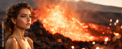 Fashion model portrait banner of a beautiful lady with mountain volcano fire landscape background with copy space