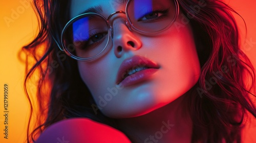 fashion, model, neon light, goggles, portrait, colourful, trendy, style, stylish, beauty, woman, face, closeup, posing, vibrant, glow, orange, blue, red, lighting, studio shot, glamour, contemporary, coiffure, make-up, expression, mood, youth, eyewear, accessory, colours, dark
