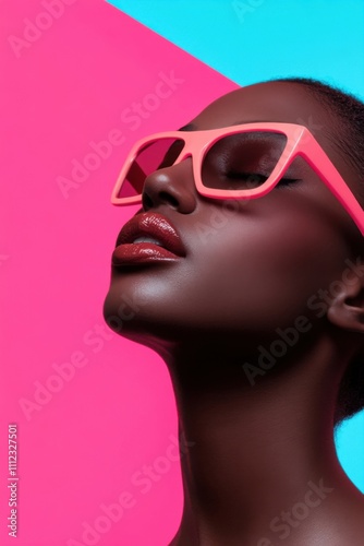 fashion, model, woman, beauty, sunglasses, lipstick, portrait, studio, pink, blue, background, colourful, vibrant, posing, style, glamour, make-up, dark skin, african american, trendy, elegant, stylish, cosmetic, skincare, accessory, eyewear, female, young adult, contemporary, pop art