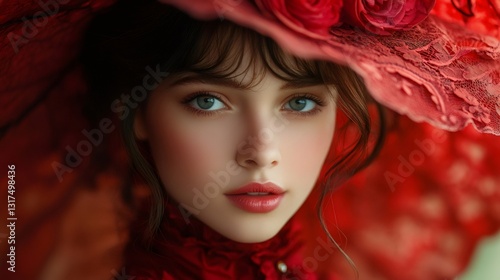 fashion, model, beauty, portrait, red, hat, dress, lace, rose, woman, girl, posing, closeup, make-up, coiffure, eye, lip, face, elegant, stylish, feminine, glamour, romantic, vintage, retro, classic, traditional, sewing, haute couture, designer, apparel, clothing, accessory, headwear, studio shot, indoor, looking, sensual, seductive, attractive, beautiful, gorgeous