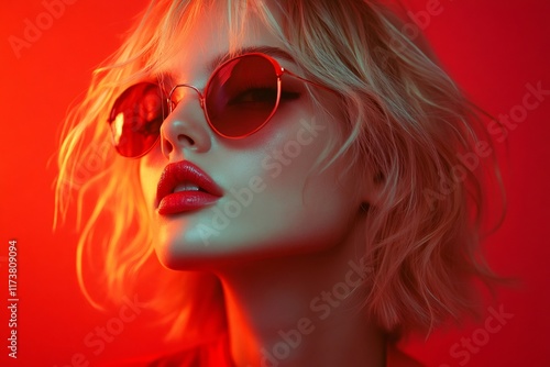 woman, model, fashion, beauty, red, sunglasses, lipstick, portrait, studio, light, blonde hair, short hair, posing, style, glamour, trendy, make-up, face, closeup, female, young adult, sensual, seductive, attractive, elegant, stylish, contemporary, vibrant, colourful, background, colours, neon, glowing, illuminated, artistic, creative, expression, mood, emotion, passion, desire, intensity, heat, warm, cool, modern, advertising, marketing