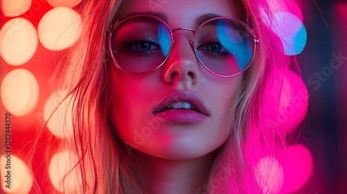 fashion, model, woman, goggles, neon light, portrait, beauty, style, trendy, nightlife, clubbing, party, glamour, vibrant, colourful, pink, blue, red, bokeh, light, stylish, eyewear, accessory, make-up, coiffure, blond, female, posing, expression, face, closeup, contemporary, cool, seductive