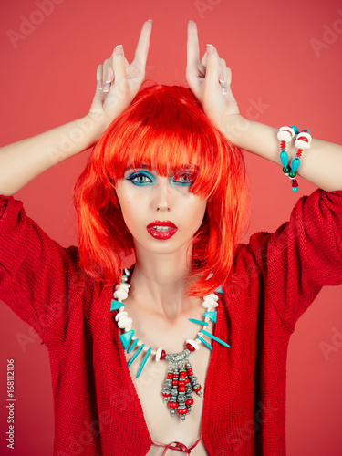woman, violet, wig, fashionable, make-up, girl, bright, artificial, hair, ethnic, jewellery, hairdresser, salon, barbershop, beauty, fashion, model, red, lip, make up, pretty, cute, adorable, sexy, desire, erotic, sexy woman, sexy girl, long, shampoo, barber, stylish, look, colours, orange, background, antler, horn