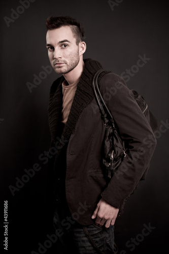 dark, fashion, photogenic, modern, youth, adult, appearance, attractive, bag, black, brown, casual attire, caucasian, confident, cool, dress, dude, face, fashionable, good, guy, hair, hand, hood, jacket, job, lifestyle, look, macho, male, model, nice, people, portrait, pose, posing, professional, serious, sexy, smart, style, stylish, toned, trend, trendy, vogue, young, man