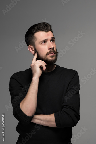 male, guy, portrait, adult, background, man, face, photogenic, person, model, stylish, casual attire, style, studio, 1, trendy, fashion, fashionable, hair, posing, elegant, young, caucasian, black, macho, standing, attractive, grey, sophisticated, confidence, expressing, wall, elegance, coiffure, modern, people, positive, human, lifestyle, pose, over, thoughtful, hand, scratching, his, beard, gaze, upwards