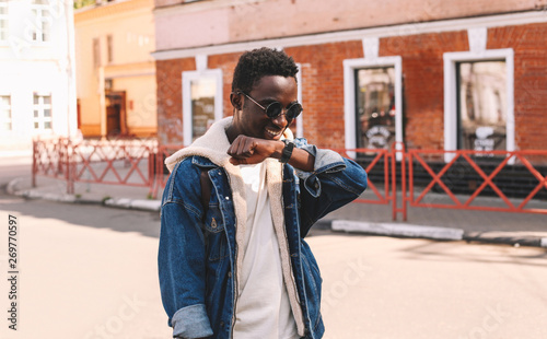 Fashion portrait smiling african man with smart watch using voice command recorder or takes calling walking on city street
