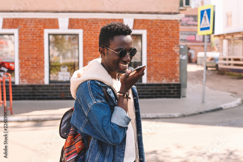 Fashion portrait smiling african man with smartphone using voice command recorder or calling walks on city street