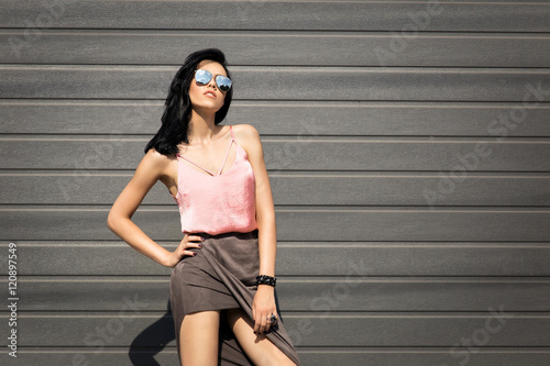 girl, woman, brunette, beautiful, sexy, fashion, photo, standing, keep, hair, sunglasses, goggles, sky, grey, background, pink, jacket, passion, sun, day, shadow, fall, caucasian