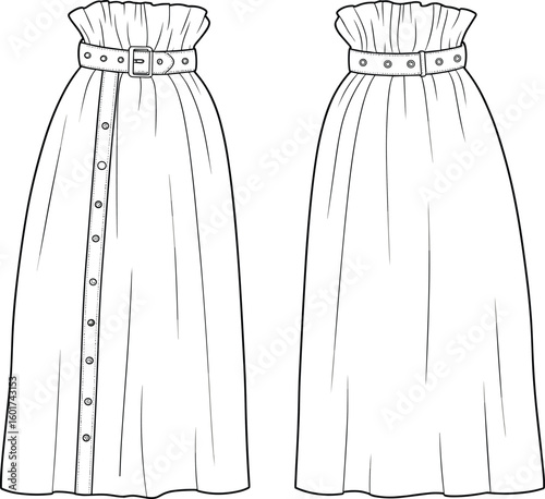 Fashion sketch of belted skirt front and back views with button detail and structured silhouette, garment layout, cad drawing flat vector illustration
