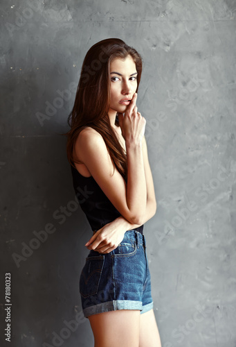 fashion, woman, sexy, model, hipster, thoughtful, urban, short, jean, girl, short, young, female, beautiful, people, beauty, background, girl, pretty, person, style, caucasian, blue, denim, sensual, portrait, attractive, posing, casual attire, lady, jean, trendy, wall, lifestyle, street, clothes, grunge, texture, scratch, black, singlet, psychological