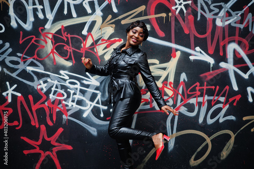 Fashionable beautiful african american woman posing in black leather jacket and pants at street against graffiti wall.