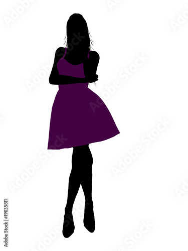 casual attire, art, illustration, silhouette, female, woman, black, brown, fashion, dress, blue, high heel, necklace, standing, purple, mini