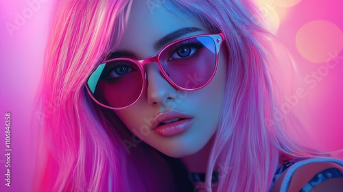 Fashionable female model with Pink Hair, Trendy Sunglasses. Stylish Party Glamour Outfit. Young Beautiful European girl Posing in Studio. Gorgeous fashion woman
