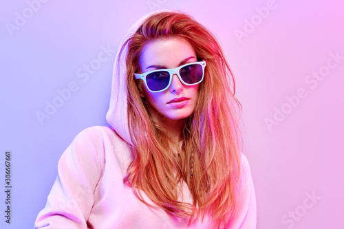 Fashionable hipster woman in Trendy outfit, stylish hair, makeup on pink purple neon light. Redhead model in hoodie, fashion sunglasses. Beautiful girl in autumn fall neon style